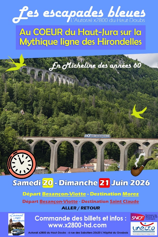 Prochaine circulation sur cette ligne des hirondelles, le samedi 20 juin au départ de Besançon-Viotte et à destination de Morez et le dimanche 21 juin au départ de Besançon-Viotte et à destination de St-Claude.